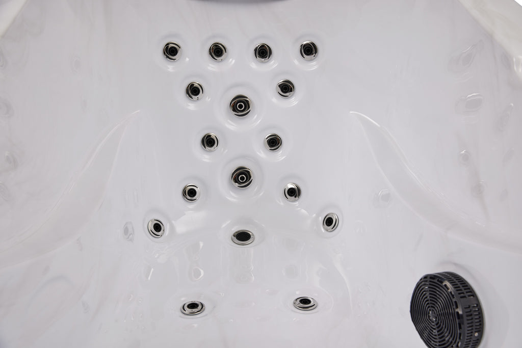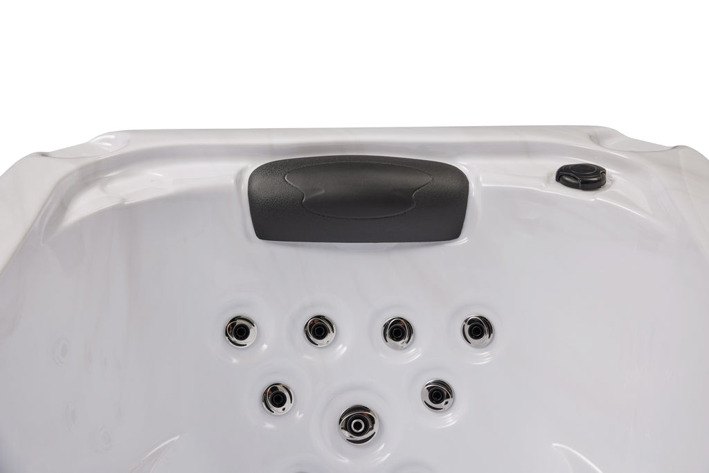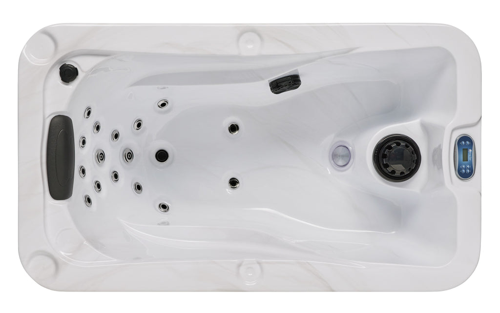 The Solo 1-person deluxe home spa with cloud gray interior provides all the features of larger hot tubs in a comfortable and spacious single lounger design. The Solo home spa is the perfect retreat for those looking for a luxury spa with a space saving design without sacrificing comfort. The Solo features 20 adjustable massage jets strategically located for deep tissue massage of the upper and lower back, and legs. The integrated cushioned neck pillow and LED lighting help maximize relaxation and complete this well-acquainted spa. Full foam insulation improves energy efficiency and reduces operating costs in colder climates. The gray polystyrene skirt is designed for years of use without fading or rotting. The built-in exterior LED lighting in the hot tub skirt of this modern hot tub will elevate the ambience of your deck. This spa also comes with a deluxe UV rated spa cover and premium steps.